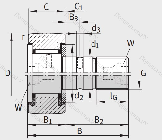 Подшипник KR 62 PP A его конструкция практически полностью повторяет роликовые подшипниковые системы за исключением наличия втулки, которая является одновременно дорожкой качения, выполняя тем самым функцию отсутствующей внутренней шины (движение осуществляется по утолщенной головке стержня). На поверхности детали находится смазочный канал, через который осуществляется обслуживание (загрузка смазочного материала). Наружная шина утолщена и имеет сферическую (выпуклую) форму. Может комплектоваться игольчатыми роликами или другими подшипниковыми телами.