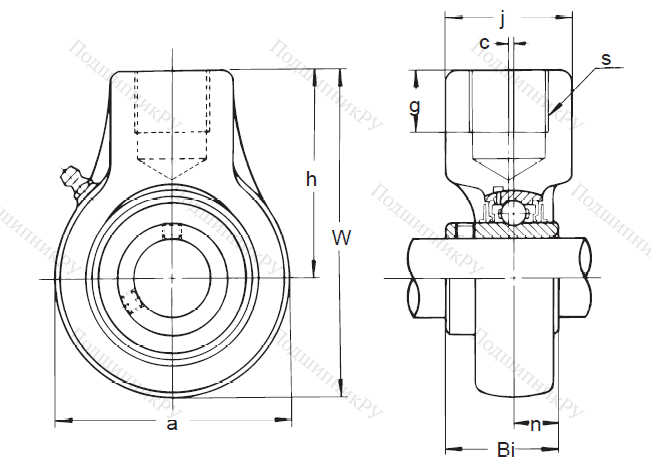 Изделия прикрепляются непосредственно к ножке, оснащенной резьбой, «вверх тормашками» и фиксируются на опорных вертикальных или горизонтальных поверхностях при помощи крепежных болтов. Головка оснащена гнездом для тела качения UC-типа – однорядного аксиального шарикоподшипника, прикрученного к валу при помощи пары винтов, для которых в расширенном внутреннем кольце имеются отверстия. Предусмотрена установка элементов разновидности UK с использованием закрепительной втулки.
