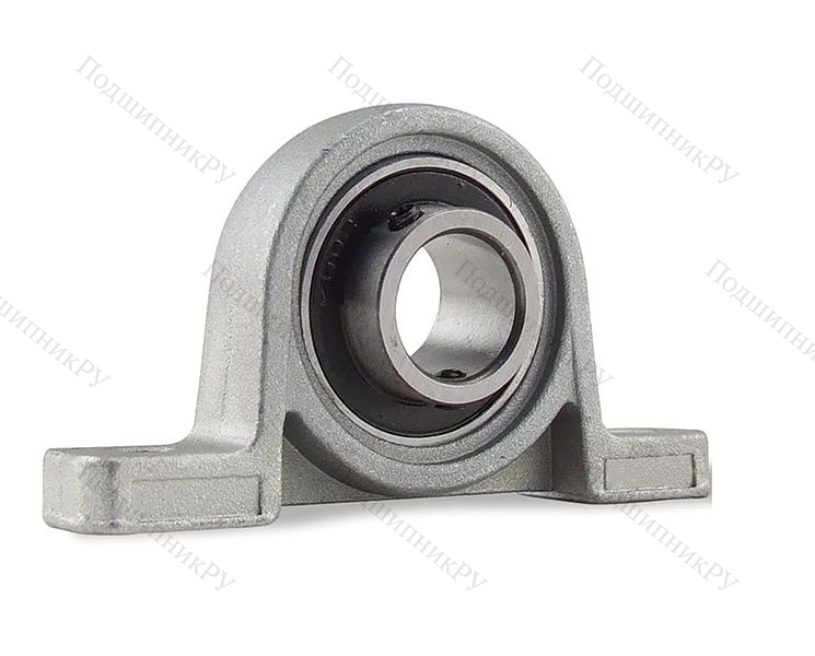 В конструкцию детали входит корпусный подшипник типа UC, установленный в корпус типа Р из чугуна с нишей сферической формы. Монтаж на вал осуществляется посредству кольца, оснащенного парой штифтов, закручиваемых шестигранником, что обеспечивает самовыравнивание.